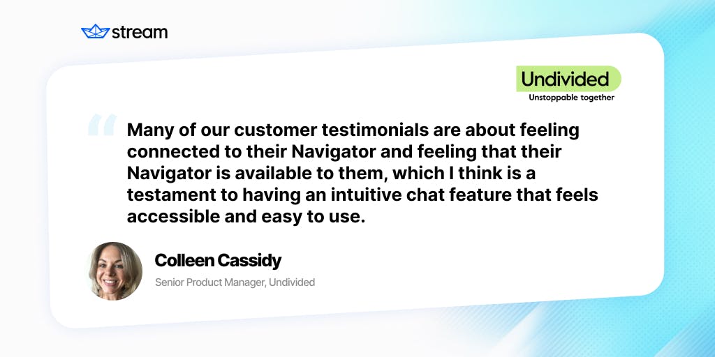 Cassidy says, "Many of our customer testimonials are about feeling connected to their Navigator and feeling that their Navigator is available to them, which I think is a testament to having an intuitive chat feature that feels accessible and easy to use."