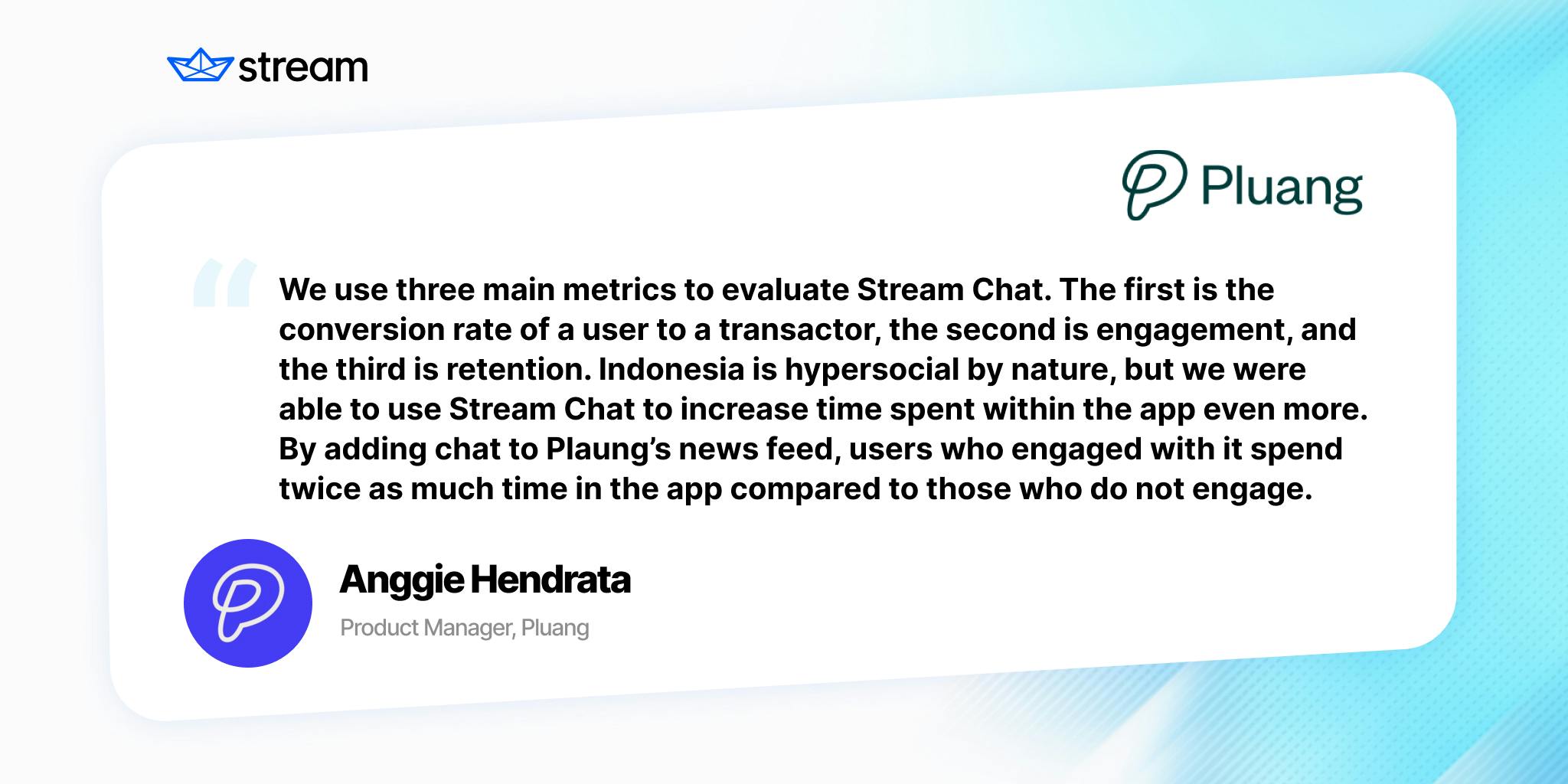 The ROI of Stream is measured carefully by the Pluang team. Hendrata shares that by integrating Stream Chat, the investment platform has not only seen an increase in in-app conversions but has even doubled user engagement.