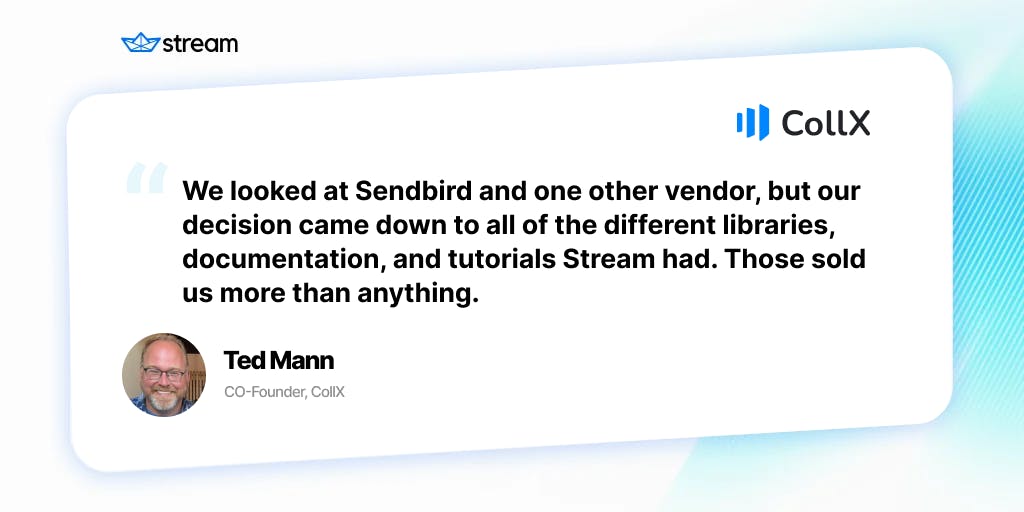 Mann says, "We looked at Sendbird and one other vendor, but our decision came down to all of the different libraries, documentation, and tutorials Stream had. Those sold us more than anything."