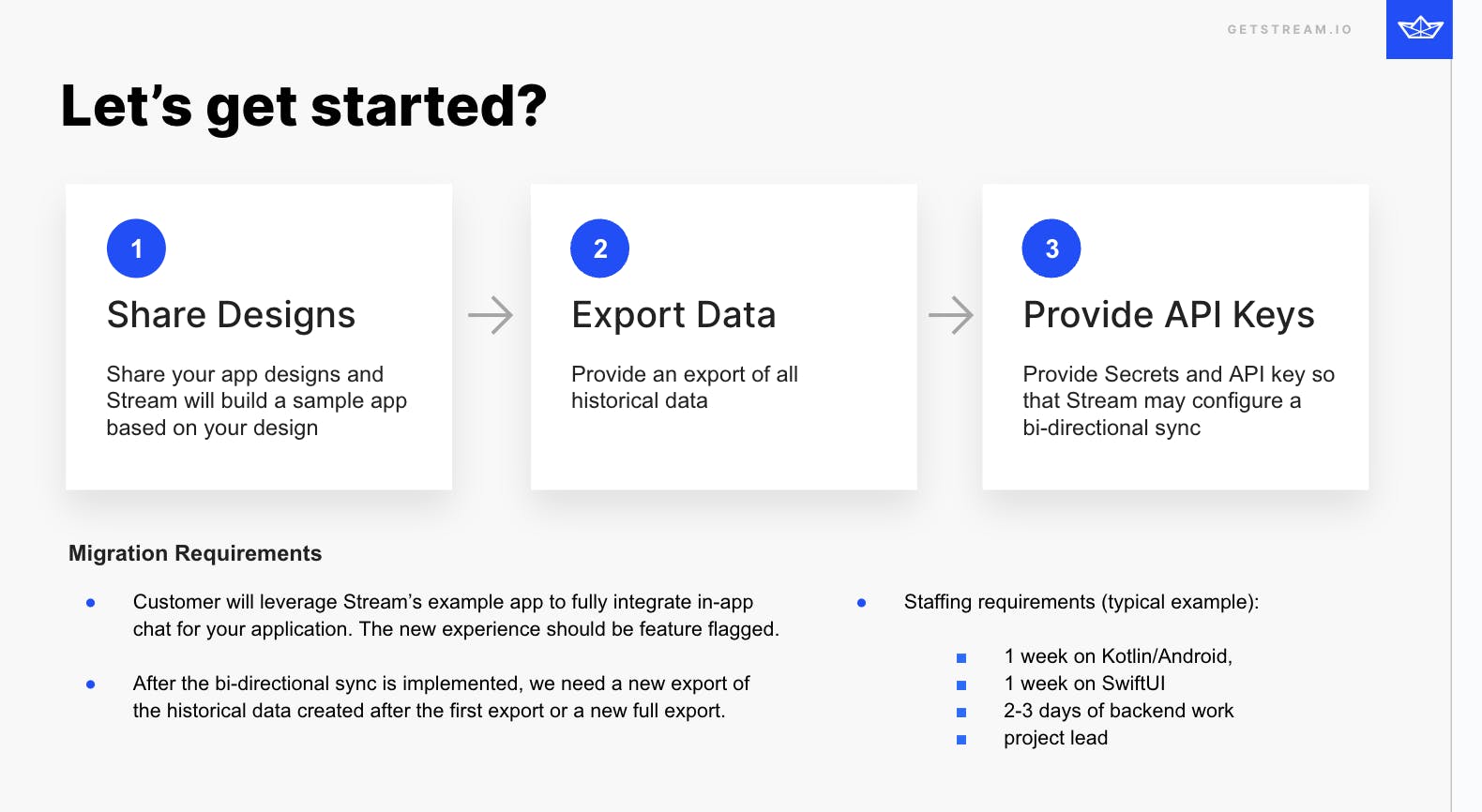 Decide on your timeline and share this information with the Stream Customer Success team. The CS team will sign a Joint Action Plan with you that will cover timelines and expectations for the migration.
