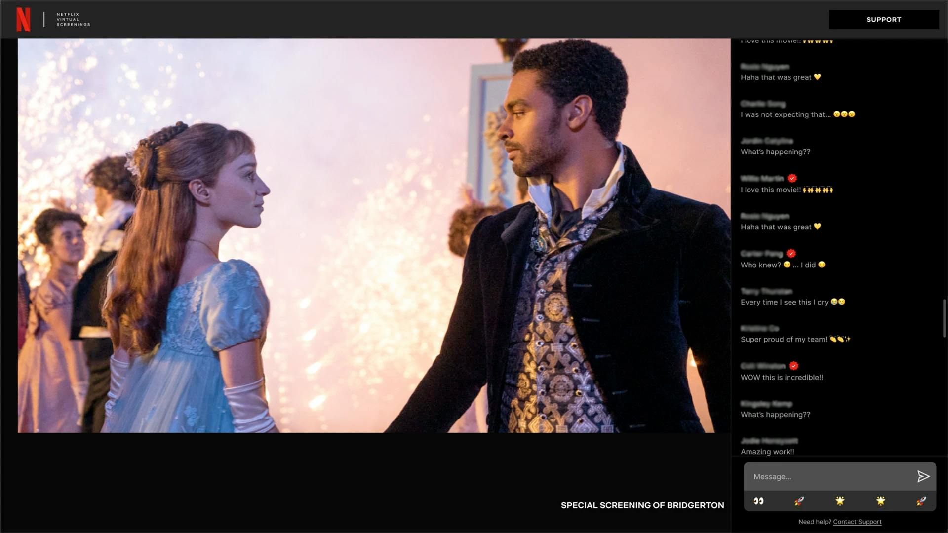 The example above showcases a partnership "in full bloom." Little Cinema Digital partnered with Netflix to host their highly anticipated 'sneak peek' digital event for Bridgerton Season 3. Over 30,000 fans joined from all over the world for an exclusive advanced look at Season 3. This included a live Q&A powered by Stream Chat with the creators and talent to expand the reach of their content and create viral conversations around their IP.