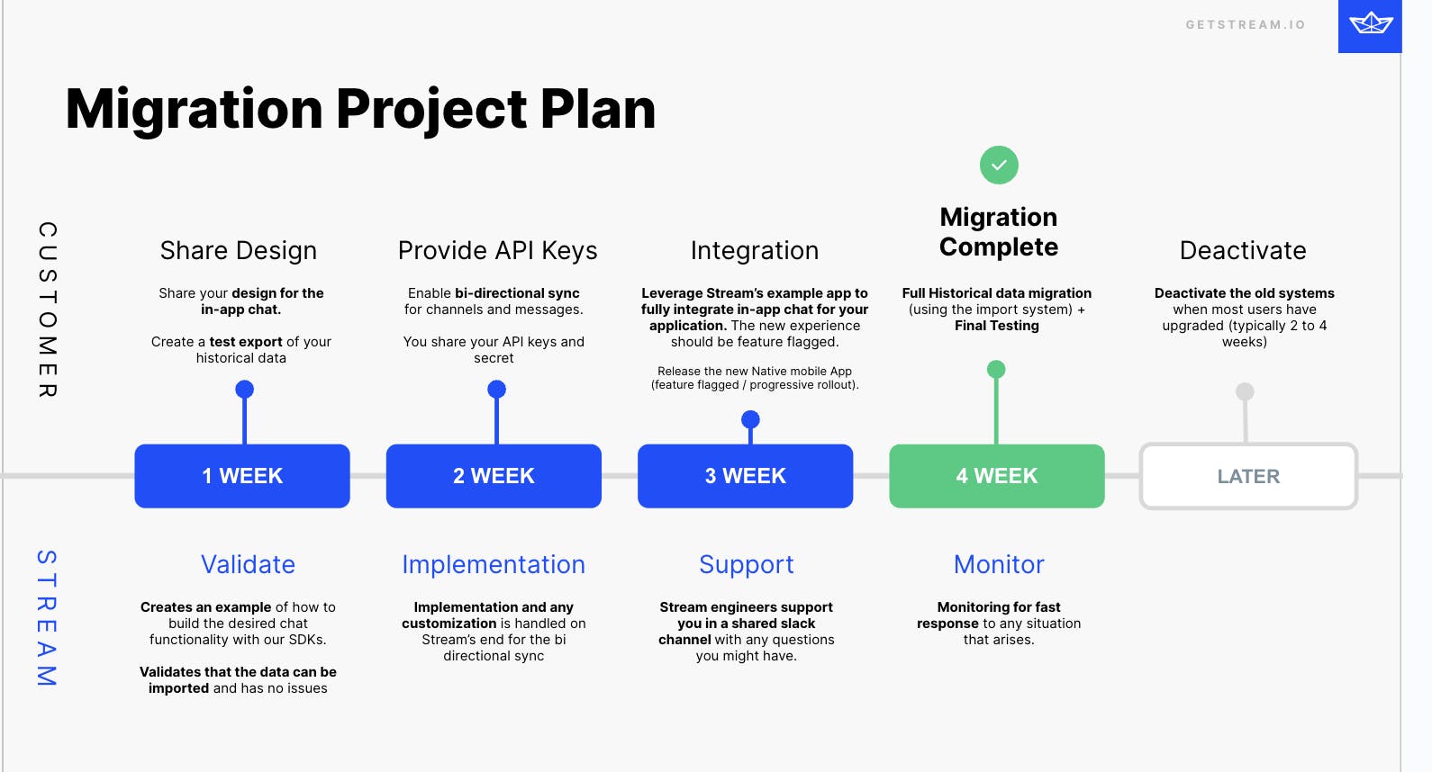 Decide on your timeline and share this information with the Stream Customer Success team. The CS team will sign a Joint Action Plan with you that will cover timelines and expectations for the migration.