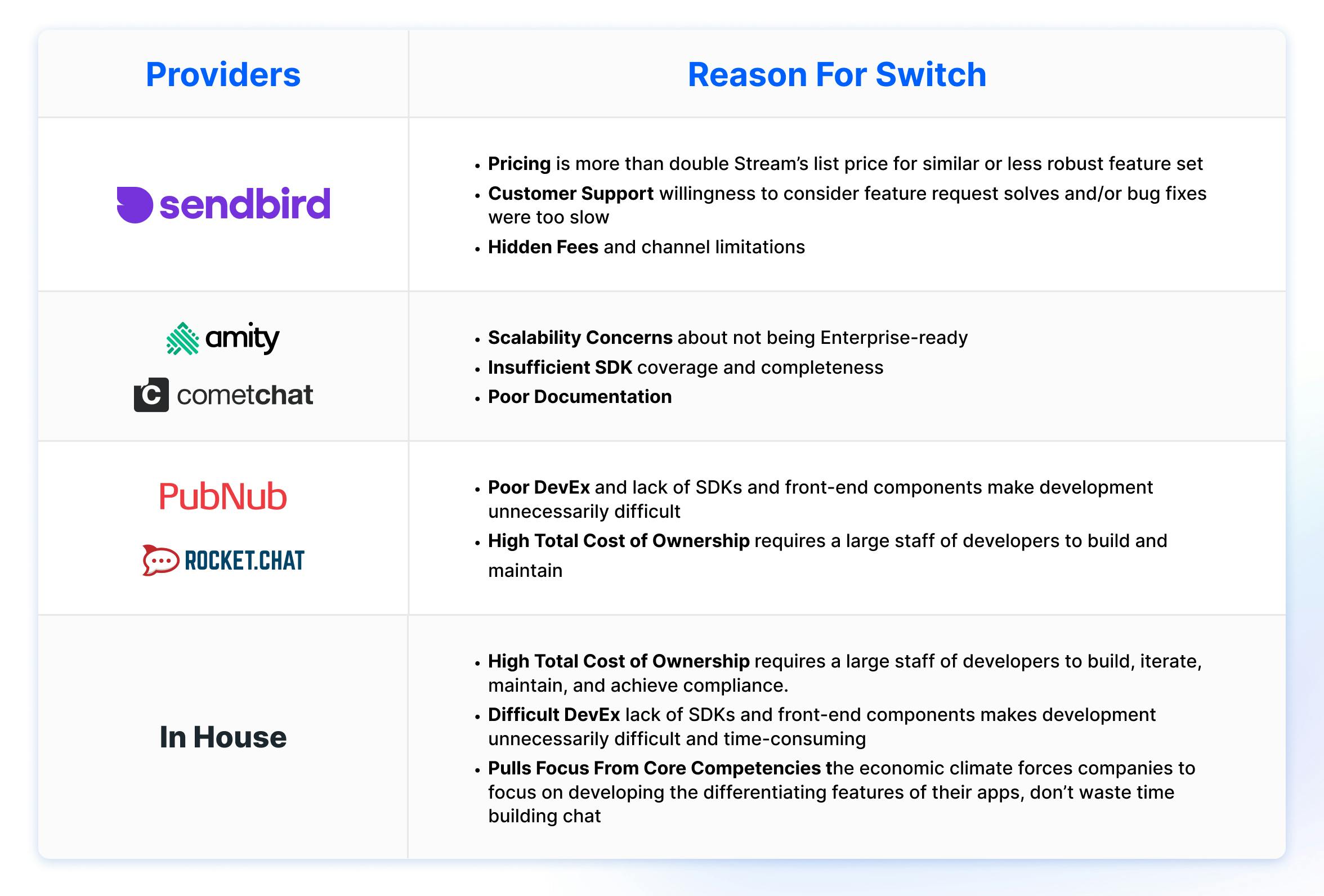 First, let's dive deeper into some of the most common reasons customers switch to Stream. We see consistent themes of replacing in-house solutions or switching from other vendors in the chat API ecosystem.